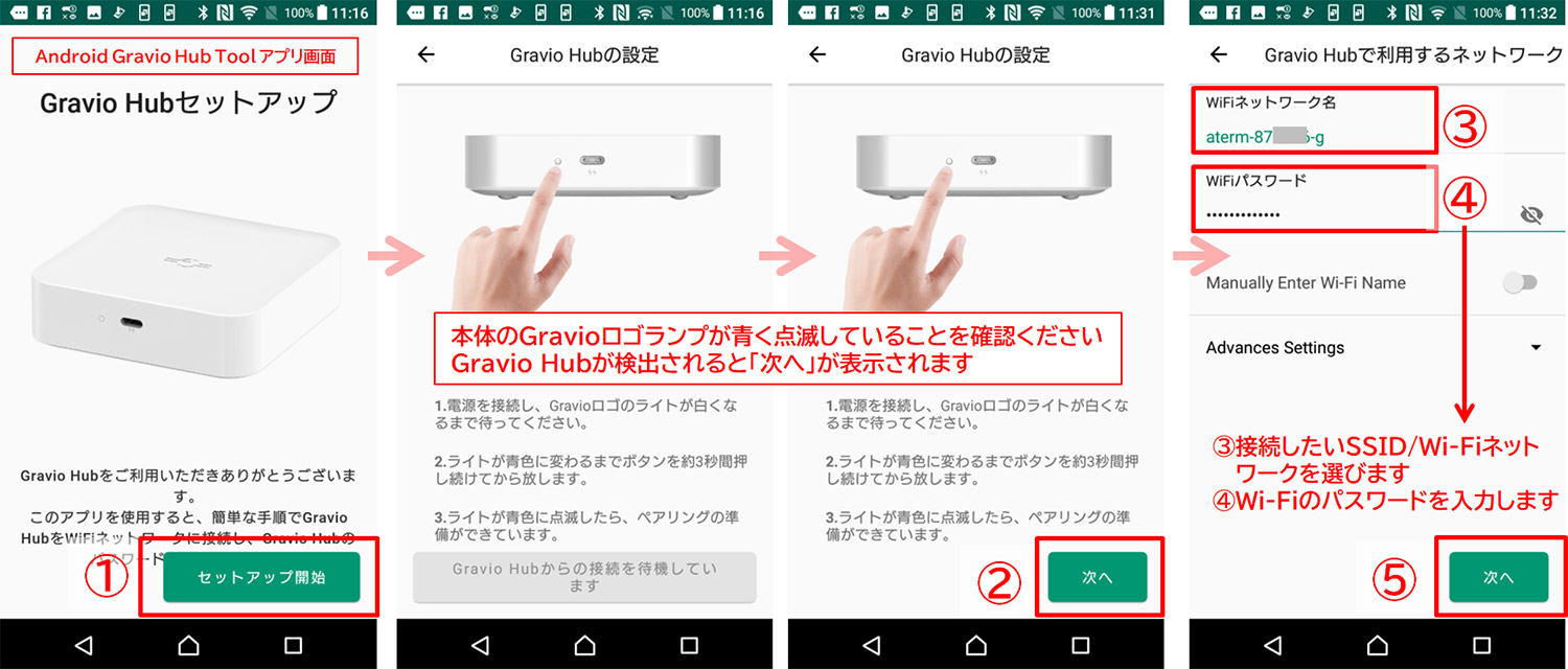 3)本体のGravio Hubロゴが青く点滅していることを確認します。